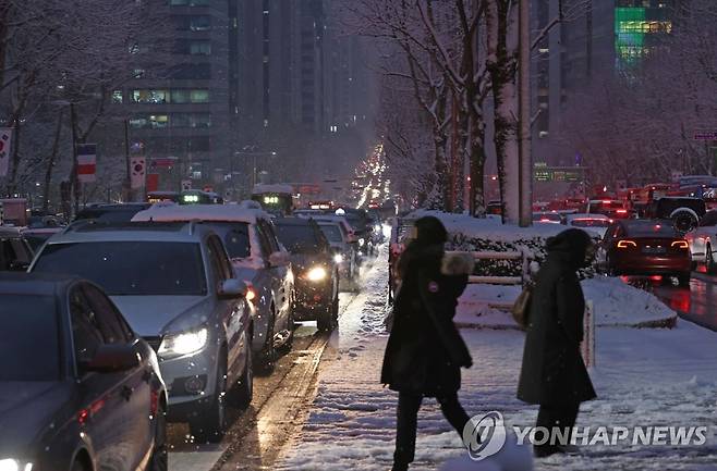 (서울=연합뉴스) 이진욱 기자 = 많은 눈이 내린 12일 오후 서울 강남구에서 한 시민이 교통대란을 피해 지하철역으로 향하고 있다. 2021.1.12