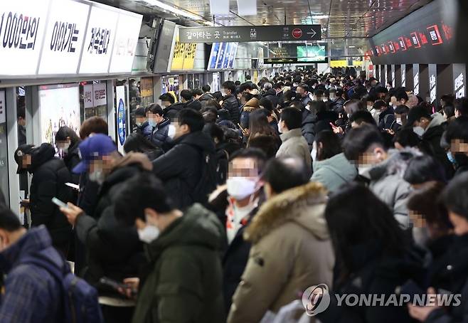(서울=연합뉴스) 한종찬 기자 = 많은 눈이 내린 12일 오후 서울 지하철 강남역 승강장이 퇴근하는 시민들로 붐비고 있다. 2021.1.12