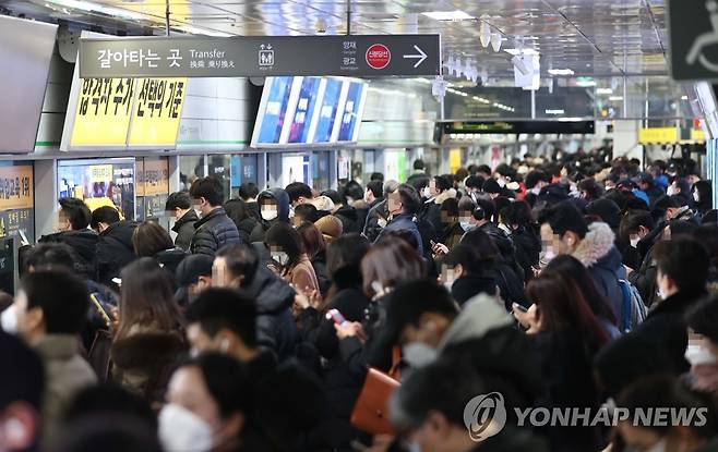 (서울=연합뉴스) 한종찬 기자 = 많은 눈이 내린 12일 오후 서울 지하철 강남역 승강장이 퇴근하는 시민들로 붐비고 있다. 2021.1.12