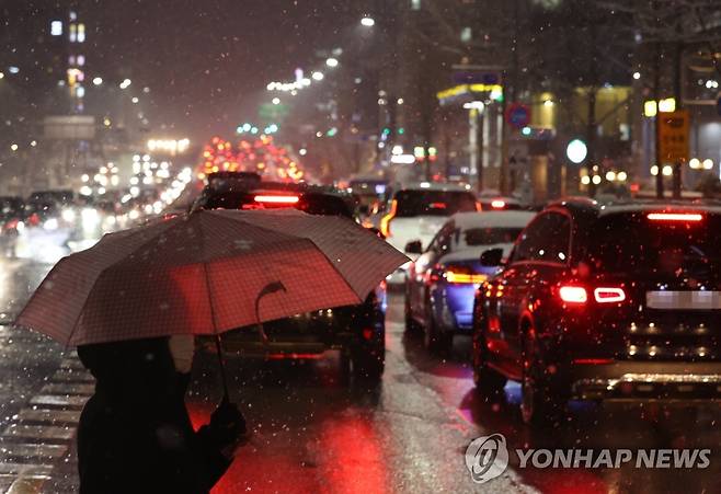 (서울=연합뉴스) 이진욱 기자 = 많은 눈이 내린 12일 오후 서울 역삼역 인근 도로가 퇴근길 차량으로 꽉 막혀 있다. 2021.1.12