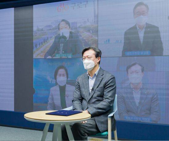 채현일 영등포구청장이 12일 오전 영등포구청 스튜디오 틔움에서 구로·금천·양천구청장과 함께 안양천 종합관리를 위한 '안양천 명소화' 온라인 업무협약을 체결했다.