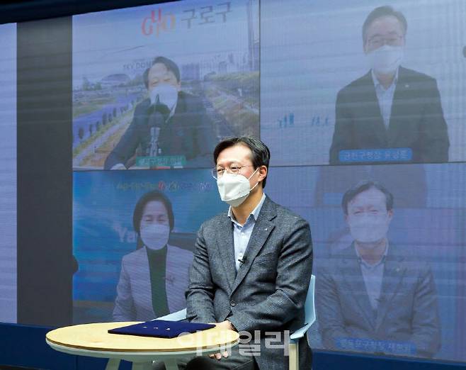 [이데일리 김태형 기자] 채현일 영등포구청장이 12일 영등포구청 스튜디오 틔움에서 구로·금천·양천구청장과 함께 안양천 종합관리를 위한 ‘안양천 명소화’ 온라인 업무협약을 체결하고 있다.