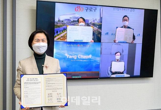 [이데일리 김태형 기자] 김수영 양천구청장이 12일 금천·구로·영등포구청장들과 안양천 명소화를 위한 업무협약식을 화상을 통해 진행하고 있다.