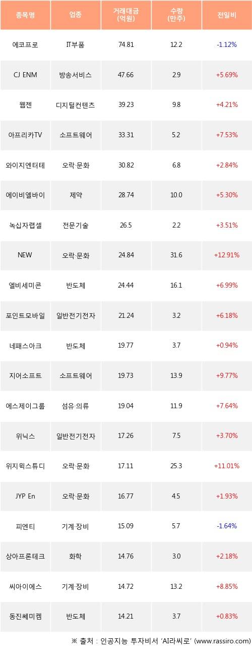 기관 투자자의 순매수 상위 20개 종목은 에코프로, CJ ENM, 웹젠, 아프리카TV, 와이지엔터테인먼트, 에이비엘바이오, 녹십자랩셀, NEW, 엘비세미콘, 포인트모바일등이다.