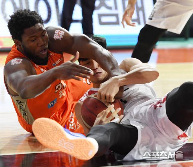 KGC 문성곤이12일 인천 삼산체육관에서 진행된 전자랜드와의 경기에서 탐슨과 루스볼을 다투고있다. 2021.01.12. 김도훈기자 dica@sportsseoul.com