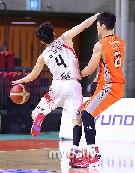 [마이데일리 = 인천 한혁승 기자] KGC 이재도(왼쪽)가 12일 오후 인천 삼산월드체육관에서 열린 2020-2021 프로농구 전자랜드-KGC 경기에서 전자랜드 이대헌에게 밀려 넘어지고 있다.- ⓒ마이데일리(www.mydaily.co.kr). 무단전재&재배포 금지 -