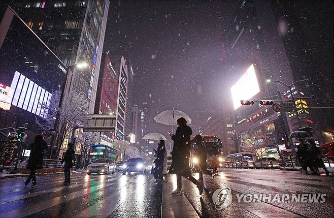 (서울=연합뉴스) 한종찬 기자 = 눈이 내린 12일 저녁 서울 강남역 인근에서 시민들이 퇴근길을 재촉하고 있다. 2021.1.12