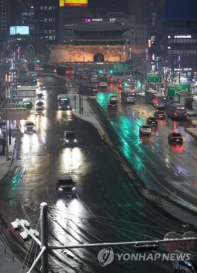 (서울=연합뉴스) 임헌정 기자 = 많은 눈이 내린 12일 오후 서울 중구 세종대로 숭례문에서 서울역을 잇는 도로가 제설작업이 이뤄져 원활한 차량흐름을 보이고 있다. 2021.1.12