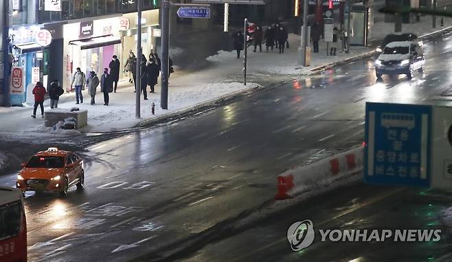 (서울=연합뉴스) 임헌정 기자 = 많은 눈이 내린 12일 오후 서울 중구 세종대로 숭례문에서 서울역을 잇는 도로가 제설작업이 이뤄져 원활한 차량흐름을 보이고 있는 반면 인도에는 눈이 그대로 쌓여 있다. 2021.1.12
