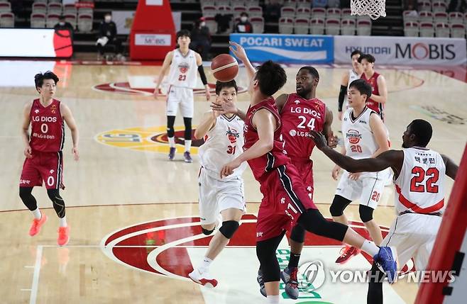 (창원=연합뉴스) 김동민 기자 = 12일 경남 창원시 의창구 창원체육관에서 열린 '2020-2021 현대모비스 프로농구' 창원 LG 세이커스와 울산 현대모비스 피버스의 경기. 양팀 선수가 볼다툼을 하고 있다. 2021.1.12