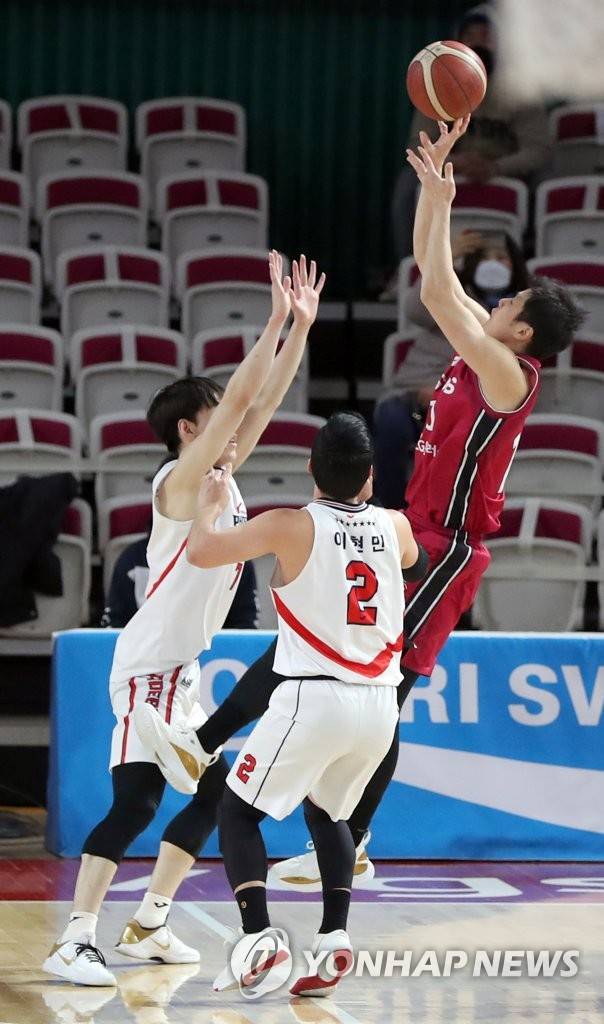 (창원=연합뉴스) 김동민 기자 = 12일 경남 창원시 의창구 창원체육관에서 열린 '2020-2021 현대모비스 프로농구' 창원 LG 세이커스와 울산 현대모비스 피버스의 경기. LG 조성민이 슛하고 있다. 2021.1.12