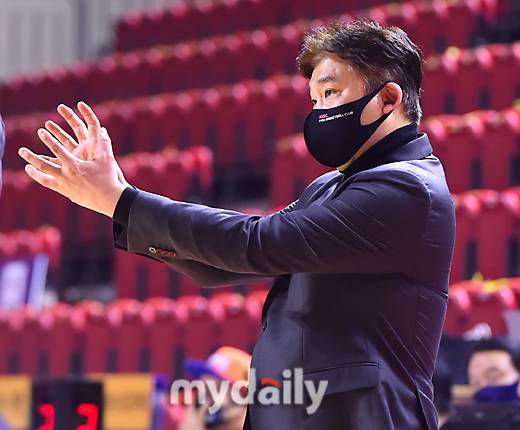 [마이데일리 = 인천 한혁승 기자] KGC 김승기 감독이 12일 오후 인천 삼산월드체육관에서 열린 2020-2021 프로농구 전자랜드-KGC 경기에서 작전 지시를 하고 있다.- ⓒ마이데일리(www.mydaily.co.kr). 무단전재&재배포 금지 -