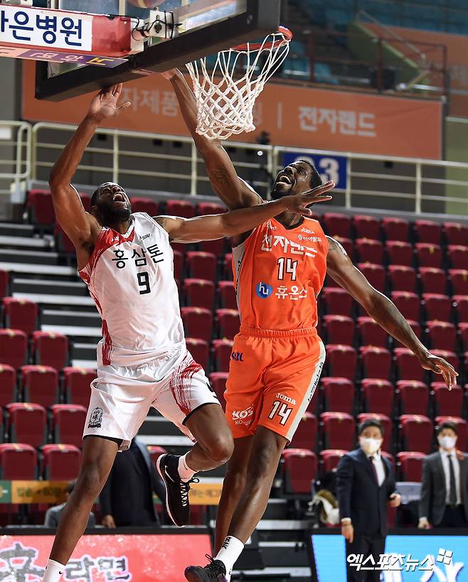 [엑스포츠뉴스 인천, 김한준 기자] 12일 오후 인천광역시 부평구 삼산월드체육관에서 열린 '2020~2021 현대모비스 프로농구' 인천 전자랜드와 안양 KGC의 경기, 전자랜드 심스가 KGC 윌리엄스의 레이업을 블락하고 있다.