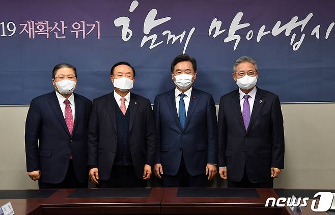 (서울=뉴스1) = 서정협 서울시장 권한대행이 12일 오후 서울 종로구 한국교회총연합을 찾아 대표단과 기념촬영을 하고 있다. 왼쪽부터 소강석 회장, 장종현 회장, 서 권한대행, 이철 회장.(서울시 제공) 2021.1.12/뉴스1