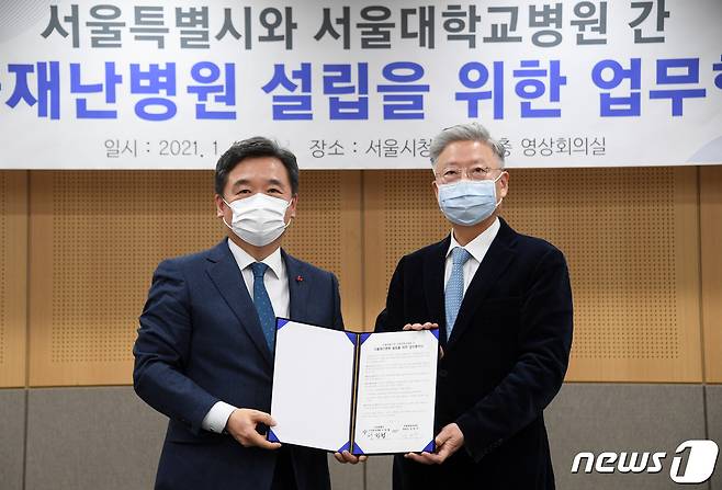 (서울=뉴스1) = 서정협 서울시장 권한대행(왼쪽)과 김연수 서울대학병원장이 12일 서울시청에서 열린 '서울시-서울대학교병원 간 서울재난병원 설립을 위한 업무협약식'에서 협약서에 서명 후 기념촬영을 하고 있다.(서울시 제공) 2021.1.12/뉴스1