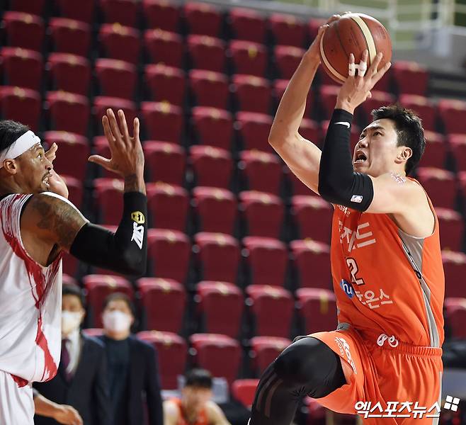 [엑스포츠뉴스 인천, 김한준 기자] 12일 오후 인천광역시 부평구 삼산월드체육관에서 열린 '2020~2021 현대모비스 프로농구' 인천 전자랜드와 안양 KGC의 경기, 전자랜드 정효근이 레이업을 시도하고 있다.