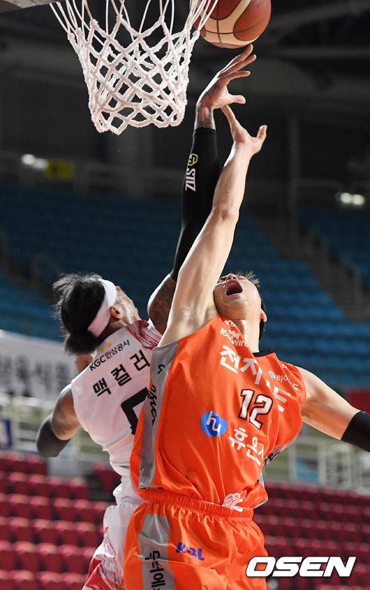 3쿼터 전자랜드 정효근이 KGC 맥컬리에게 슛블록을 당하고 있다./rumi@osen.co.kr