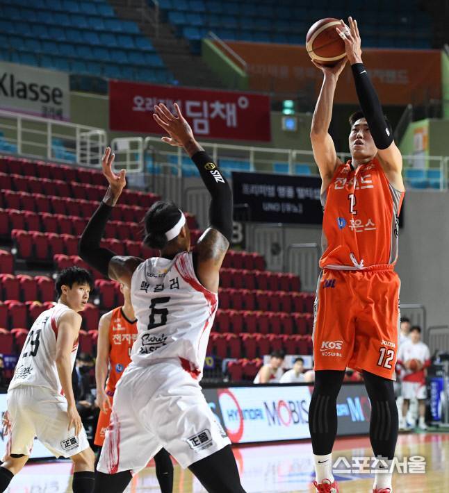 전자랜드의 정효근이 12일 인천 삼산체육관에서 진행된 KGC와의 경기에서 미들슛을 시도하고있다. 2021.01.12. 김도훈기자 dica@sportsseoul.com