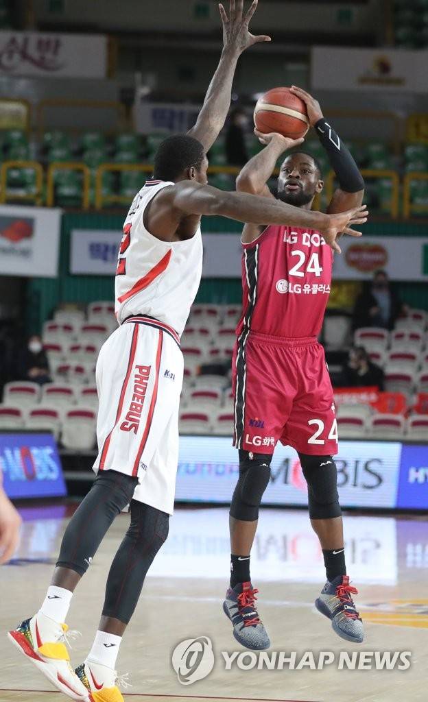 (창원=연합뉴스) 김동민 기자 = 12일 경남 창원시 의창구 창원체육관에서 열린 '2020-2021 현대모비스 프로농구' 창원 LG 세이커스와 울산 현대모비스 피버스의 경기. LG 테리코 화이트가 슛하고 있다. 2021.1.12
