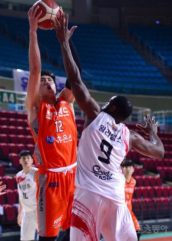 12일 인천 삼산체육관에서 열린 ‘2020-2021 현대모비스 프로농구’ 인천 전자랜드와 안양 KGC인삼공사 경기에서 전자랜드 정효근이 KGC인삼공사의 수비를 뚫고 골밑 슛을 하고 있다.