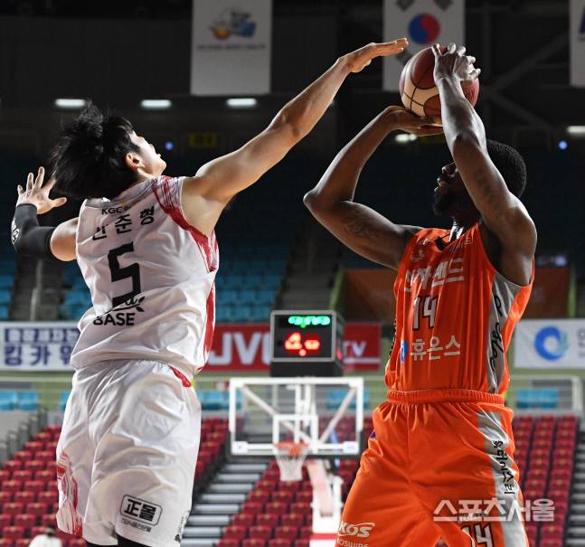 전자랜드의 심스가 12일 인천 삼산체육관에서 진행된 KGC와의 경기에서 변준형의 수비에 맞서 슛을 시도하고있다. 2021.01.12. 김도훈기자 dica@sportsseoul.com