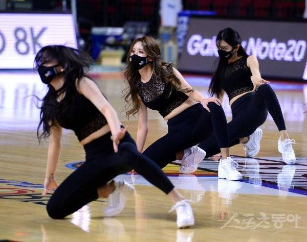 12일 인천 삼산체육관에서 열린 ‘2020-2021 현대모비스 프로농구’ 인천 전자랜드와 안양 KGC인삼공사 경기에서 치어리더가 공연을 펼치고 있다.