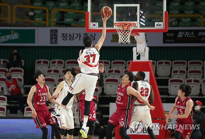 (창원=연합뉴스) 김동민 기자 = 12일 경남 창원시 의창구 창원체육관에서 열린 '2020-2021 현대모비스 프로농구' 창원 LG 세이커스와 울산 현대모비스 피버스의 경기. 현대모비스 최진수가 슛하고 있다. 2021.1.12