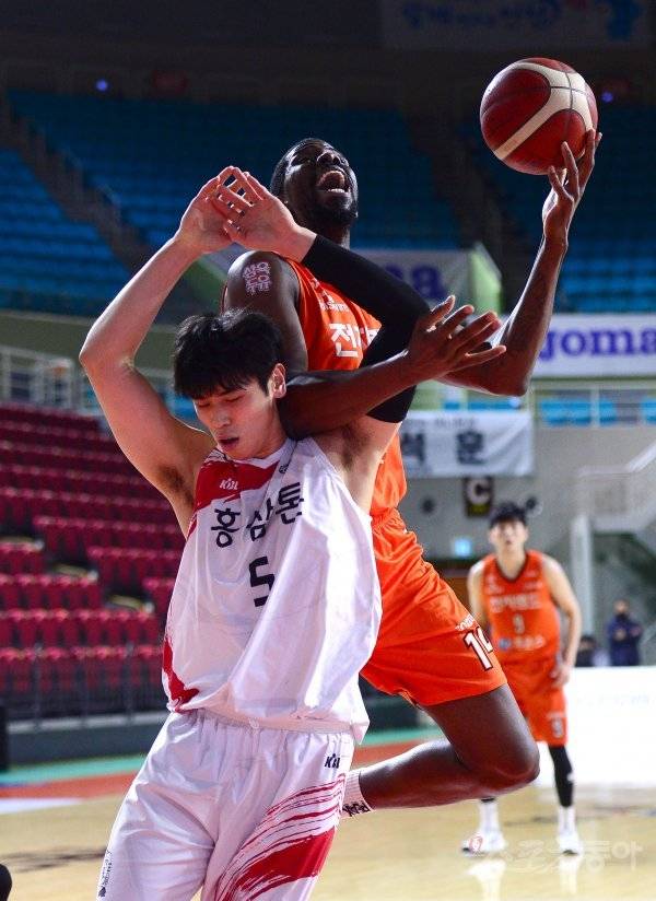 12일 인천 삼산체육관에서 열린 ‘2020-2021 현대모비스 프로농구’ 인천 전자랜드와 안양 KGC인삼공사 경기에서 전자랜드 심스가 골밑 패스를 받아 슛을 날리고 있다.