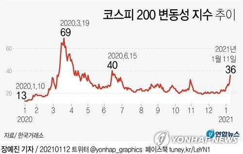 (서울=연합뉴스) 장예진 기자 = 코스피가 3,000선을 넘어 강세 흐름을 이어가는 가운데 일명 '공포 지수'로 불리는 코스피200 변동성지수(VKOSPI)가 7개월 만에 최고치를 기록했다.