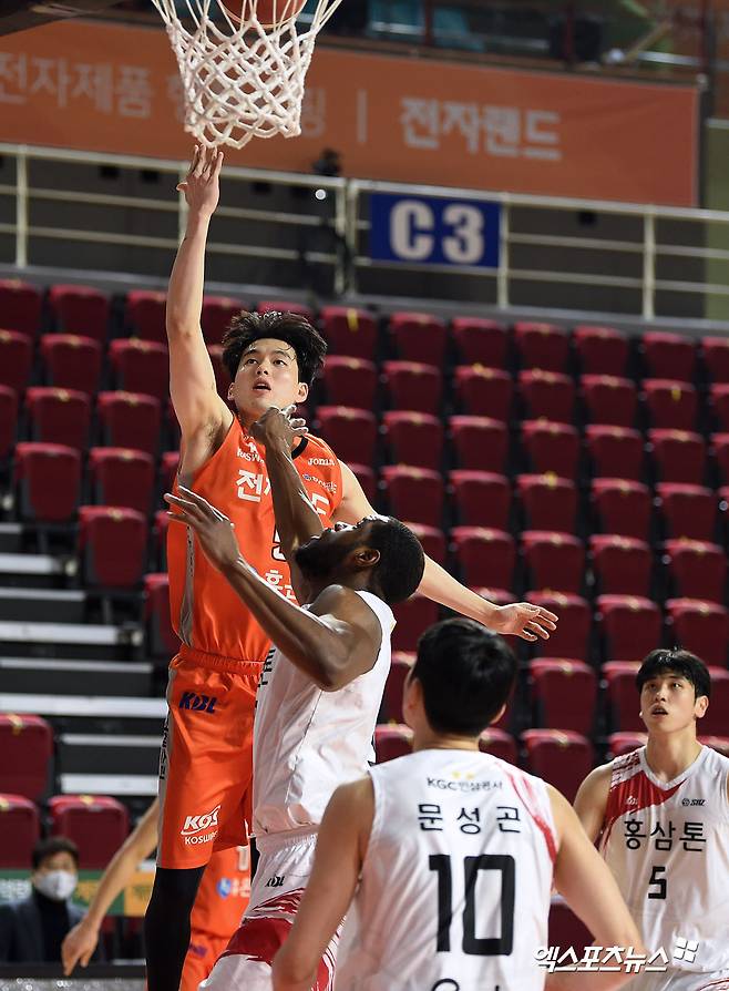 [엑스포츠뉴스 인천, 김한준 기자] 12일 오후 인천광역시 부평구 삼산월드체육관에서 열린 '2020~2021 현대모비스 프로농구' 인천 전자랜드와 안양 KGC의 경기, 전자랜드 전현우가 레이업을 시도하고 있다.
