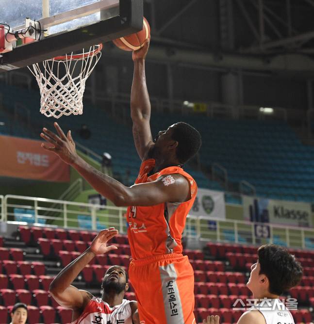 전자랜드의 심스가 12일 인천 삼산체육관에서 진행된 KGC와의 경기에서 골밑슛을 시도하고있다. 2021.01.12. 김도훈기자 dica@sportsseoul.com