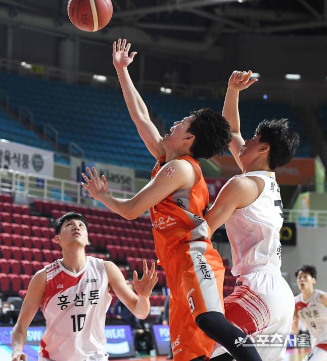 전자랜드의 전현우가 12일 인천 삼산체육관에서 진행된 KGC와의 경기에서 속공으로 슛을 시도하려다 박형철의 파울에 막히고있다. 2021.01.12. 김도훈기자 dica@sportsseoul.com