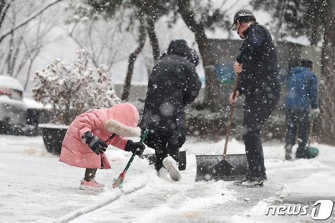 (서울=뉴스1) = 서울 성동구청 직원들이 12일 오후부터 시작된 폭설로 눈쌓인 구청사 주변 보행로에서 제설작업을 하고 있는 가운데 한 어린이가 빗자루질을 하고 있다.(성동구 제공) 2021.1.12/뉴스1