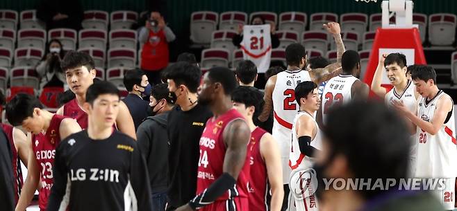 (창원=연합뉴스) 김동민 기자 = 12일 경남 창원시 의창구 창원체육관에서 열린 '2020-2021 현대모비스 프로농구' 창원 LG 세이커스와 울산 현대모비스 피버스의 경기 종료 후 양팀 선수단이 인사하고 있다. 2021.1.12