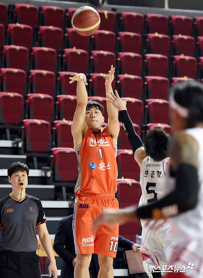 [엑스포츠뉴스 인천, 김한준 기자] 12일 오후 인천광역시 부평구 삼산월드체육관에서 열린 '2020~2021 현대모비스 프로농구' 인천 전자랜드와 안양 KGC의 경기, 전자랜드 이윤기가 3점슛을 시도하고 있다.