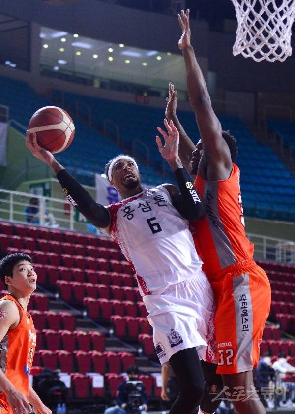 12일 인천 삼산체육관에서 열린 ‘2020-2021 현대모비스 프로농구’ 인천 전자랜드와 안양 KGC인삼공사 경기에서 KGC인삼공사 맥컬러가 전자랜드의 수비를 뚫고 골밑 슛을 하고 있다.