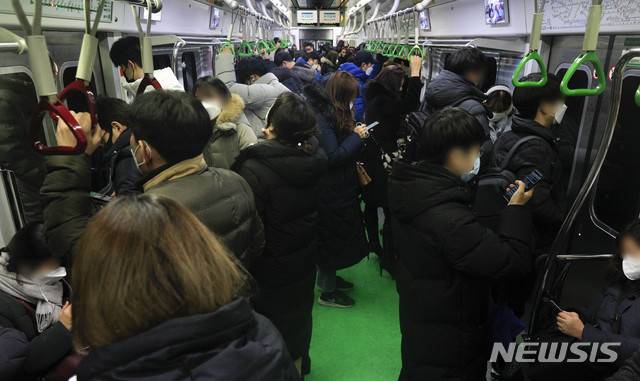 [서울=뉴시스] 박민석 기자 = 서울 지역에 눈이 내린 12일 오후 서울지하철 2호선 열차에 시민들이 탑승해 있다. 2021.01.12. mspark@newsis.com