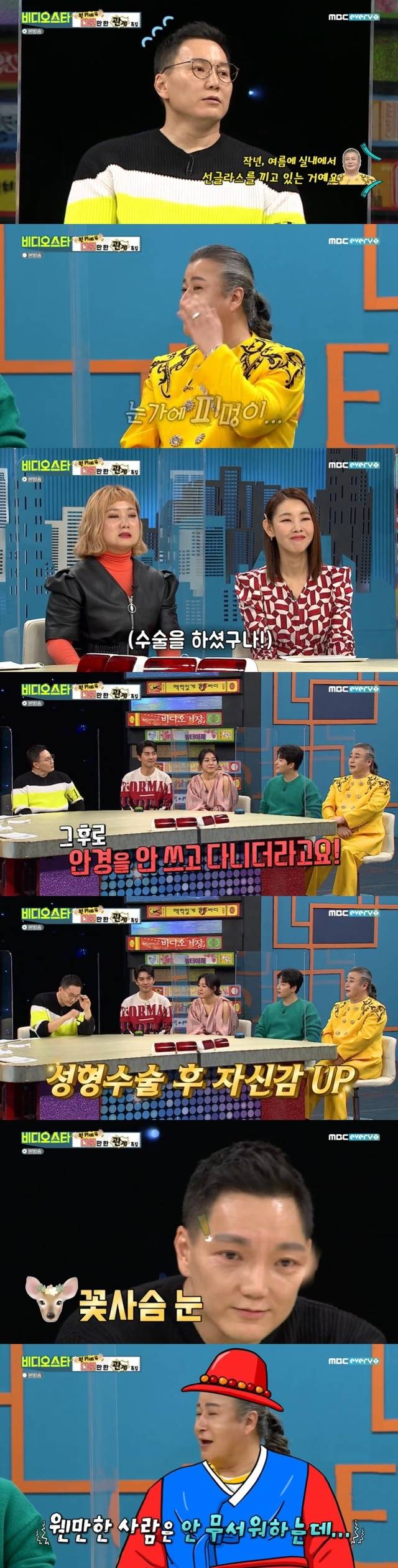 이어 파파금파는 “작년 여름에 실내 녹음실에서 선글라스 끼고 있더라. 쓱 보니 눈에 피멍이 들어있더라. 2주 지나니까 눈이 너무 예뻐졌다. 안경을 안 끼고 다니더라. 저 안경이 알이 없다. 눈 수술하고 안경을 안 끼더라”고 폭로했다.