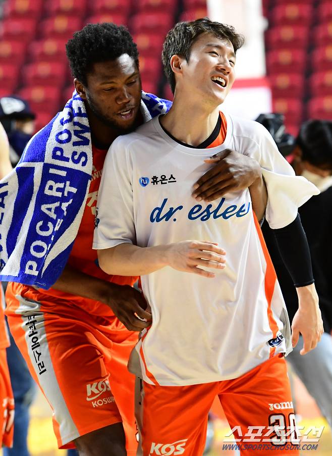 2020-2021 프로농구 인천전자랜드와 안양KGC의 경기가 12일 인천삼산실내체육관에서 열렸다. 인천 전자랜드 탐슨과 박찬희가 안양KGC에 79대 61 대승을 거두고 환호하고 있다. 인천=최문영 기자 deer@sportschosun.com /2021.01.12/