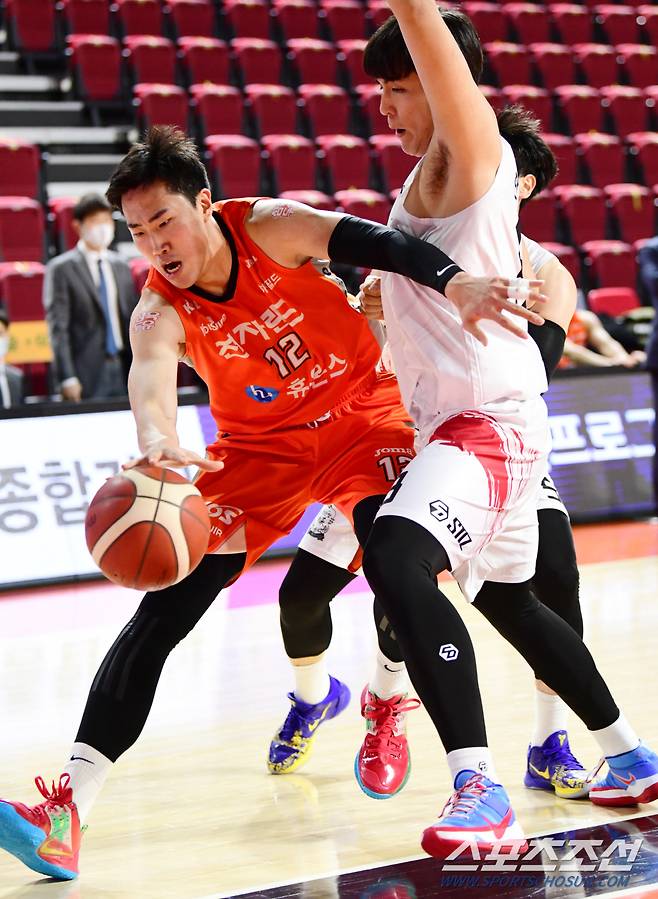 2020-2021 프로농구 인천전자랜드와 안양KGC의 경기가 12일 인천삼산실내체육관에서 열렸다. 인천 전자랜드 정효근이 안양KGC 한승희의 수비사이로 돌파를 시도하고 있다. 인천=최문영 기자 deer@sportschosun.com /2021.01.12/