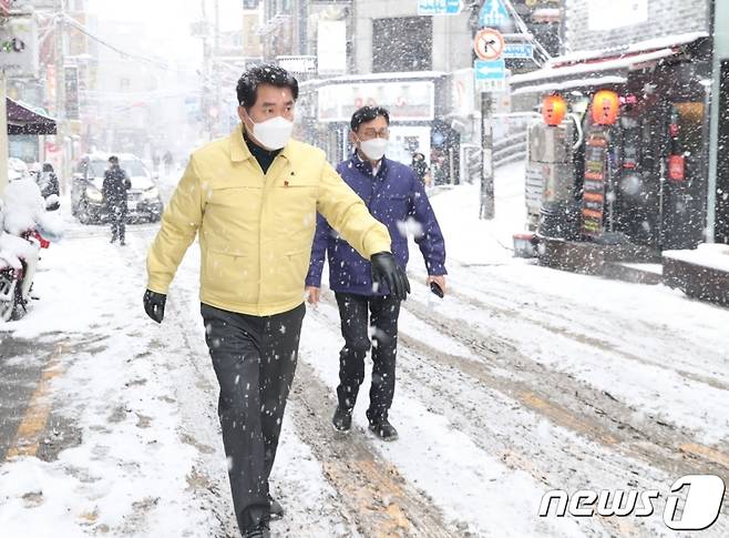 (서울=뉴스1) = 박준희 서울 관악구청장이 12일 오후 대학동 대학길 일대를 찾아 제설 상황을 점검하고 있다.(관악구 제공) 2021.1.12/뉴스1