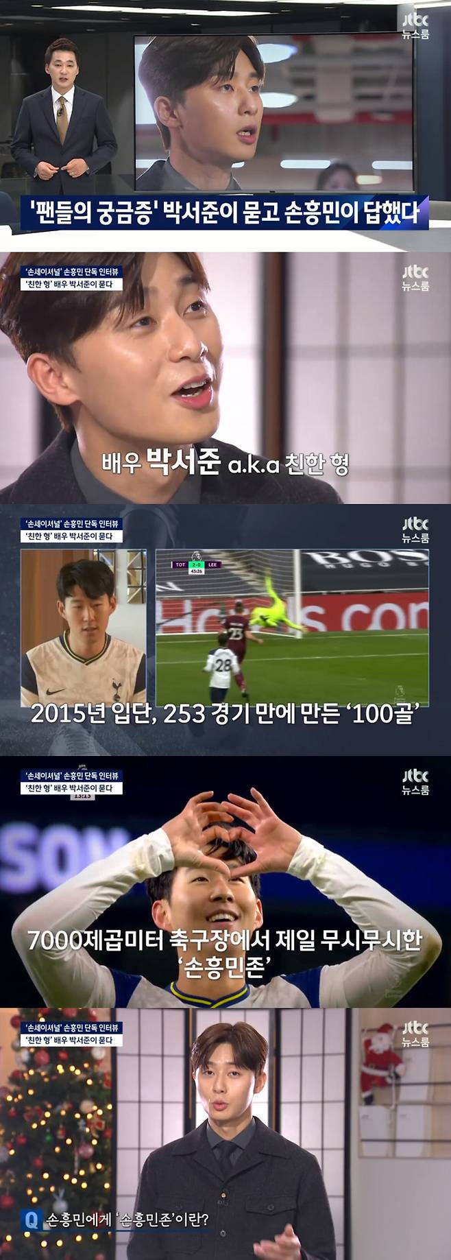 손흥민은 1일 프리미어리그(PL) 리즈 유나이티드 전에서 아시아인 최초로 구단 통산 100골을 달성했다. 이를 기념해 '뉴스룸'에서는 손흥민의 인터뷰를 진행했다. 인터뷰어로는 박서준이 나섰다. 손흥민이 박서준에게 인터뷰를 부탁했고, 박서준이 흔쾌히 수락했다고. 두 사람은 평소 절친한 사이로 유명하다.