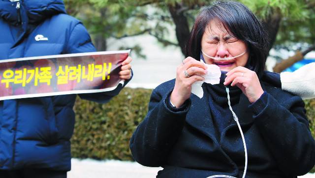 가습기살균제 피해자 조순미씨가 12일 서울중앙지법에서 SK케미칼과 애경산업 전 대표 등의 무죄 선고 소식을 듣고 눈물을 흘리고 있다. 법원은 "역사적으로 어떤 평가를 받을지 모르지만 현재까지 나온 증거를 바탕으로 판단할 수밖에 없었다"며 이들 기업이 사용한 성분이 호흡기 질환을 일으킨다는 점이 과학적으로 입증되지 않았다고 밝혔다. 피해자 측은 "내 몸에서 일어나는 일이 증거"라며 반발했다.