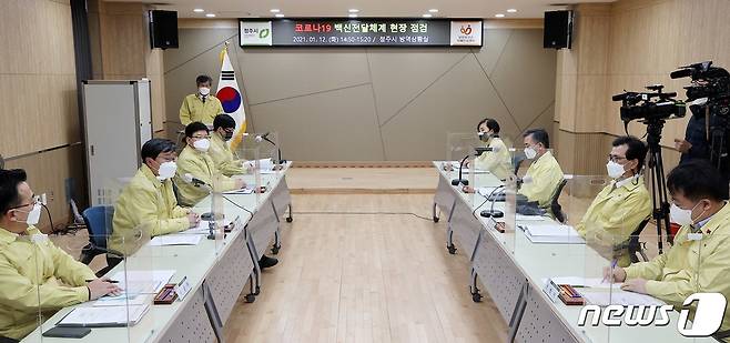 (서울=뉴스1) = 전해철 행정안전부 장관이 12일 오후 충북 청주시 상당보건소에서 코로나19 백신 전달체계 준비상황 등 점검회의를 하고 있다.(행정안전부 제공) 2021.1.12/뉴스1