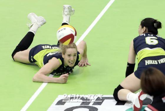 2020~2021 프로배구 V리그 여자부 현대건설과 기업은행의 경기가 12일 오후 경기도 수원실내체육관에서 열렸다. 5세트 루소가 빈 곳에 떨어지는 공을 향해 몸을 날려뵜지만 살려내지 못하고 있다.