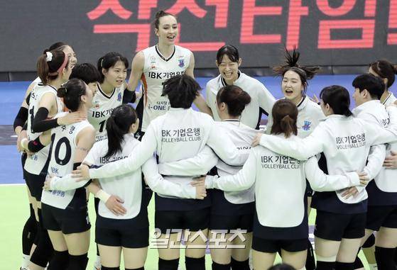 2020~2021 프로배구 V리그 여자부 현대건설과 기업은행의 경기가 12일 오후 경기도 수원실내체육관에서 열렸다. 기업은행 선수들이 풀세트 접전 끝에 세트스코어 3대 2로 역전승한 후 기뻐하고 있다.
