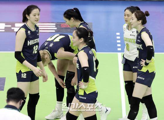 2020~2021 프로배구 V리그 여자부 현대건설과 기업은행의 경기가 12일 오후 경기도 수원실내체육관에서 열렸다. 풀세트 접전 끝에 세트스코어 3대 2로 역전패한 현대건설 선수들이 경기 후 아쉬워하고 있다.