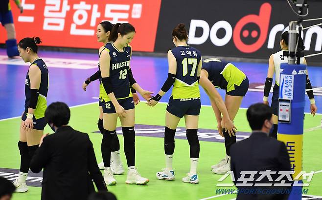 '2020-2021 V리그' 여자부 현대건설과 IBK기업은행의 경기가 12일 수원실내체육관에서 열렸다. 경기에서 패배한 현대건설 선수들이 아쉬워하고 있다. 수원=박재만 기자 pjm@sportschosun.com/2021.01.12/