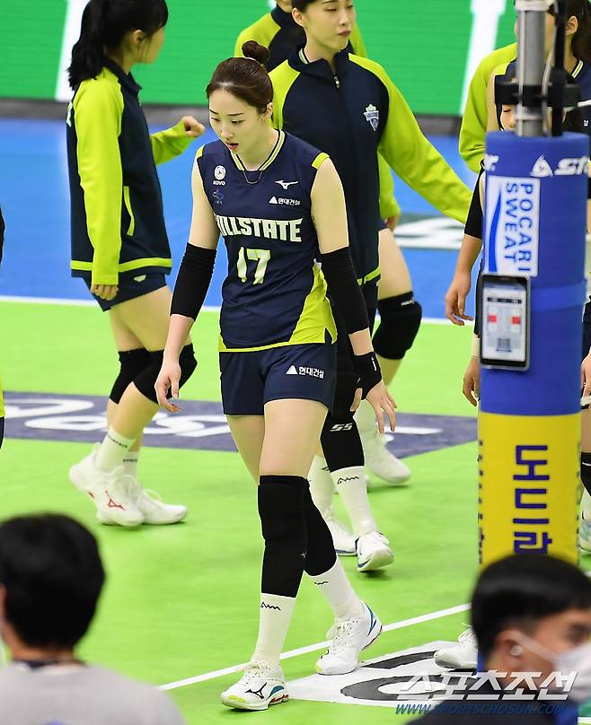 '2020-2021 V리그' 여자부 현대건설과 IBK기업은행의 경기가 12일 수원실내체육관에서 열렸다. 경기에서 패배한 현대건설 선수들이 아쉬워하고 있다. 수원=박재만 기자 pjm@sportschosun.com/2021.01.12/