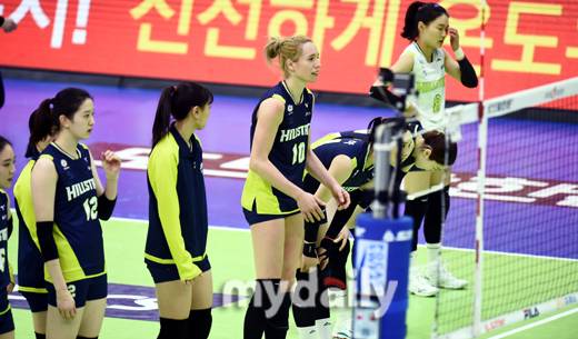[마이데일리 = 수원 곽경훈 기자] 현대건설이 12일 오후 경기도 수원실내체육관에서 진행된 '2020-2021 도드람 V-리그' 현대건설-IBK기업은행의 경기에서 세트 스코어 3-2(17-25, 25-20, 24-26, 25-18, 15-10)로 패배한뒤 아쉬워 하고 있다.
